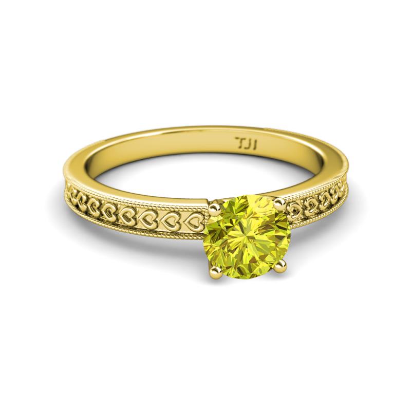 A perfect Ring to show your love and devotion, this Vintage inspired Yellow Diamond Solitaire Engagement Ring features motif of Engraved hearts all around the shank while a classy finishing touch is perfectly provided by milgrain edges.