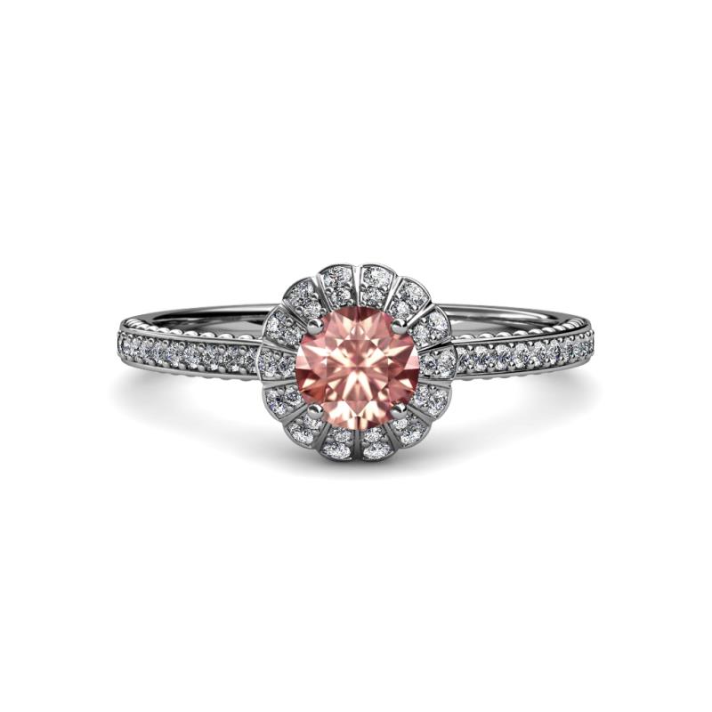 This Halo Engagement Ring is perfect to Celebrate one of the most unforgettable Moments of your Life with Center Morganite in 4 Prong Setting embraced by Dazzling Side Diamonds in a Floral Halo Design with beaded single row Pave Shank has a perfect balance of class and style.