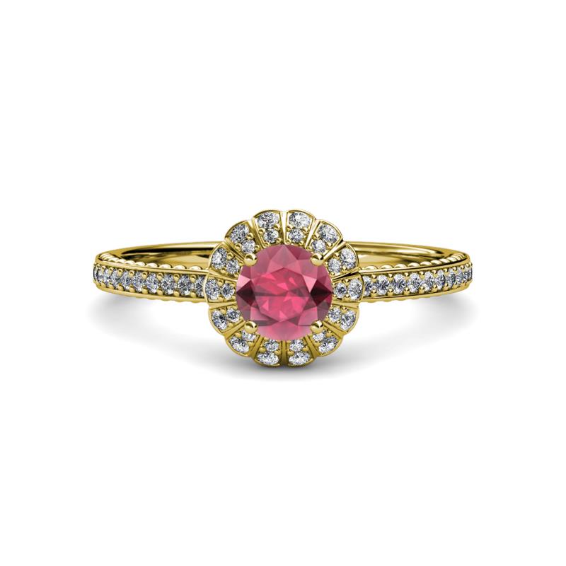 This Halo Engagement Ring is perfect to Celebrate one of the most unforgettable Moments of your Life with Center Rhodolite Garnet in 4 Prong Setting embraced by Dazzling Side Diamonds in a Floral Halo Design with beaded single row Pave Shank has a perfect balance of class and style.