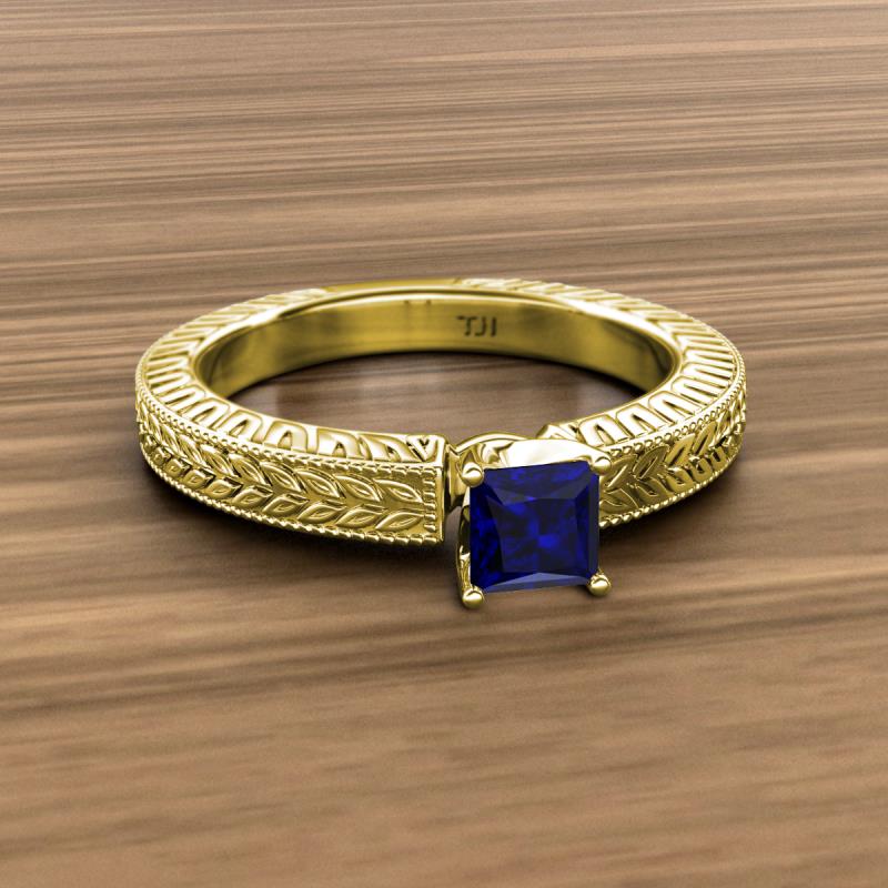 This vintage style 1.44 ct Solitaire Ring is sure to please any bride-to-be with a gleaming Princess cut Lab Created Blue Sapphire which enhances the graceful leaf work engraved on the shank including a milgrain finish that adorn this entire Ring.