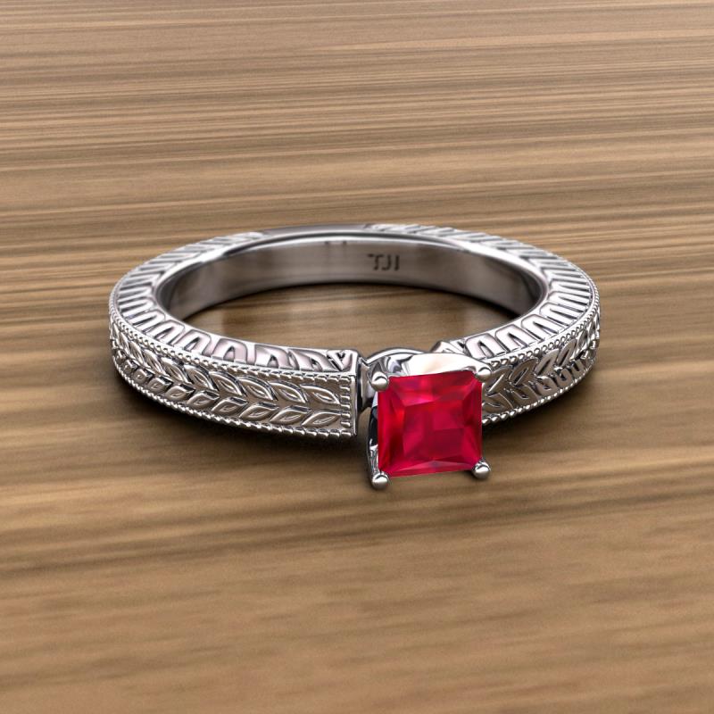 This vintage style 1.44 ct Solitaire Ring is sure to please any bride-to-be with a gleaming Princess cut Lab Created Ruby which enhances the graceful leaf work engraved on the shank including a milgrain finish that adorn this entire Ring.