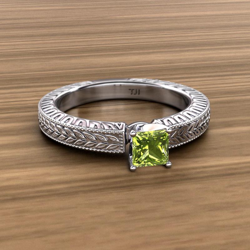 This vintage style 1.20 ct Solitaire Ring is sure to please any bride-to-be with a gleaming Princess cut Peridot which enhances the graceful leaf work engraved on the shank including a milgrain finish that adorn this entire Ring.