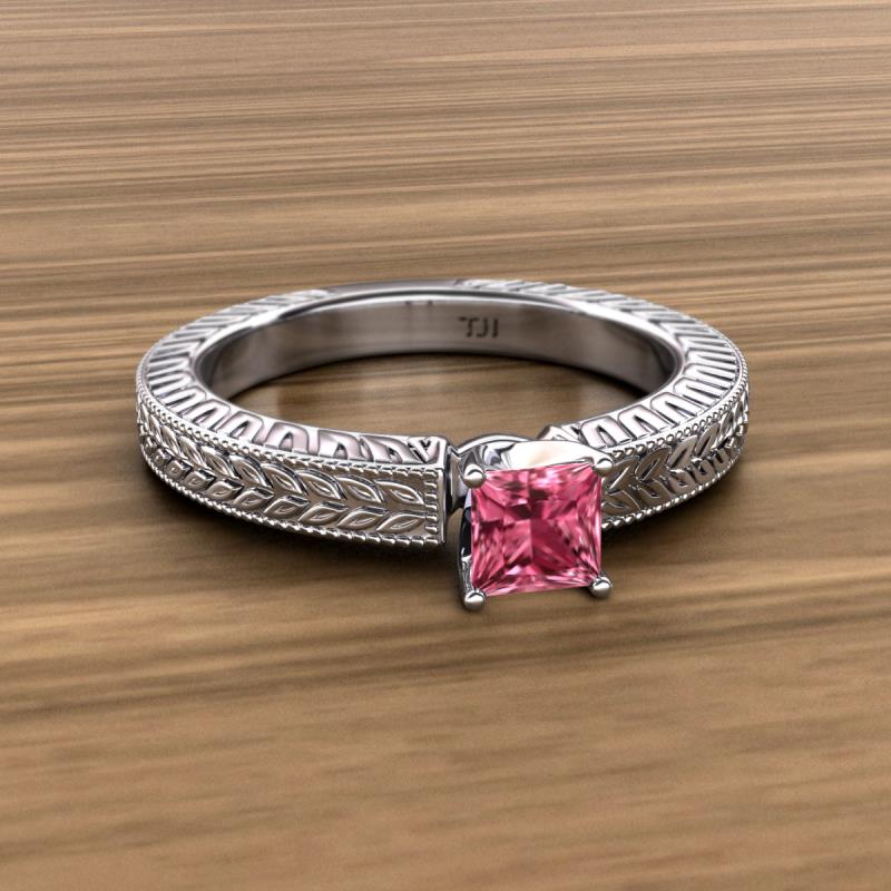 This vintage style 1.05 ct Solitaire Ring is sure to please any bride-to-be with a gleaming Princess cut Pink Tourmaline which enhances the graceful leaf work engraved on the shank including a milgrain finish that adorn this entire Ring.