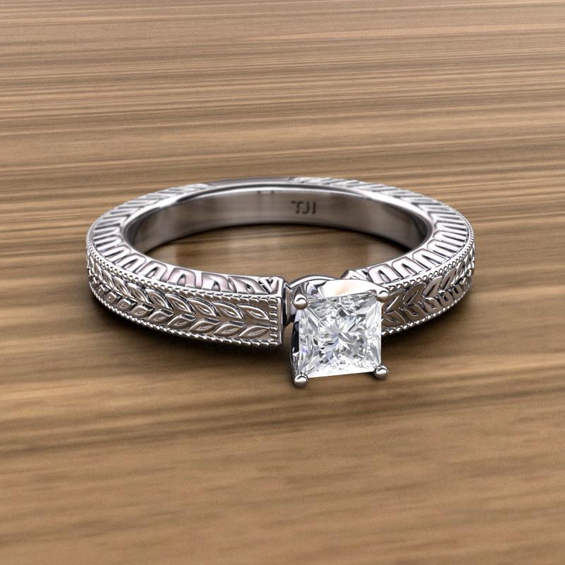 This vintage style 0.85 ct Solitaire Ring is sure to please any bride-to-be with a gleaming Princess cut White Sapphire which enhances the graceful leaf work engraved on the shank including a milgrain finish that adorn this entire Ring.