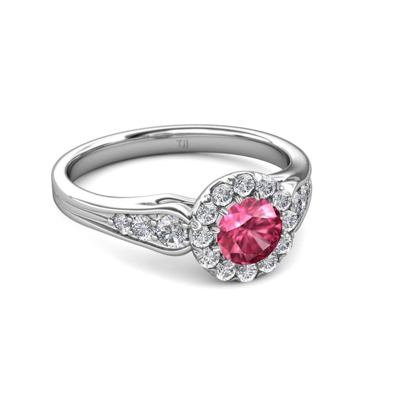 This Cupcake Halo Engagement Ring is the perfect blend of fashion and elegance. Featuring the center Pink Tourmaline With Open Head undergallery Diamonds and triple graduated pave shank , this is truly a work of art and an instant heirloom.