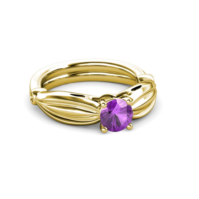 This classic Four Prong Set Amethyst Solitaire Engagement Ring features designer undergallery with rib on shoulders continuing with bezel set Diamond on side along with a double cut out pinch shank offering a bit of different flair from your standard Solitaire Ring.