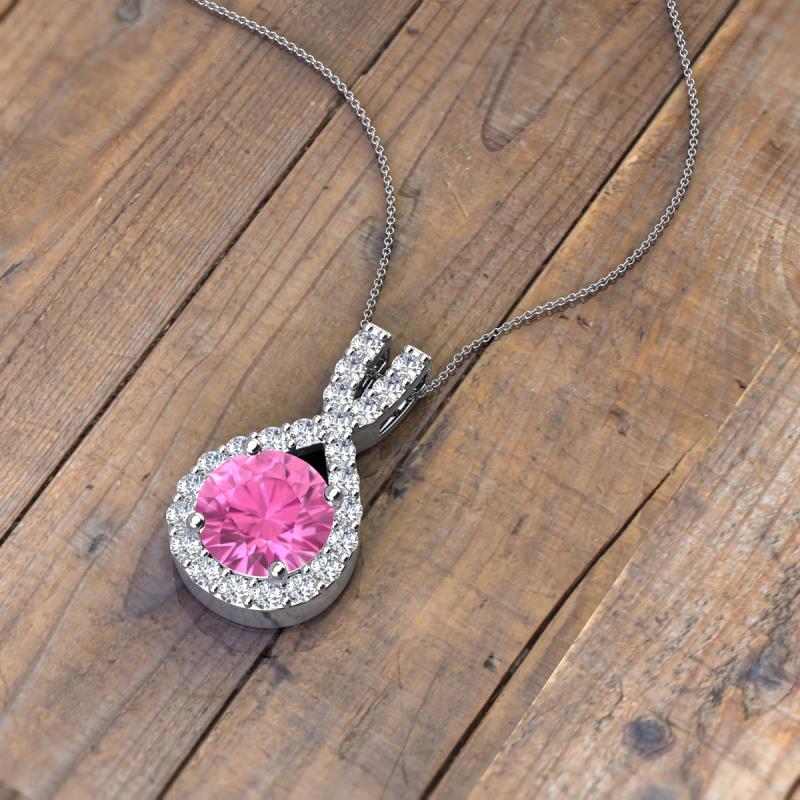 Round Lab Created Pink Sapphire and Diamond 1.31 ctw Womens Halo Pendant Necklace 14K White Gold.Included 16 Inches 14K White Gold Chain More Details ...