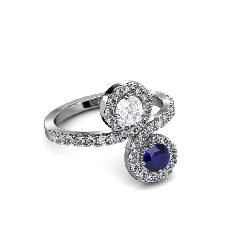 A divine symbol of togetherness, where one stone represents love and one friendship while each end of the ring swirls around the marvelous combination of Blue Sapphire & White Sapphire meeting above and below, rather than in the center.