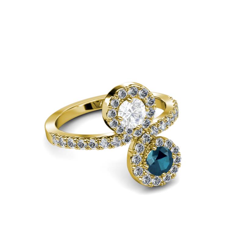 A divine symbol of togetherness, where one stone represents love and one friendship while each end of the ring swirls around the marvelous combination of Blue Diamond & White Sapphire meeting above and below, rather than in the center.