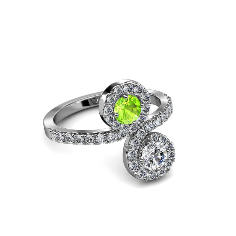 A divine symbol of togetherness, where one stone represents love and one friendship while each end of the ring swirls around the marvelous combination of Diamond & Peridot meeting above and below, rather than in the center.