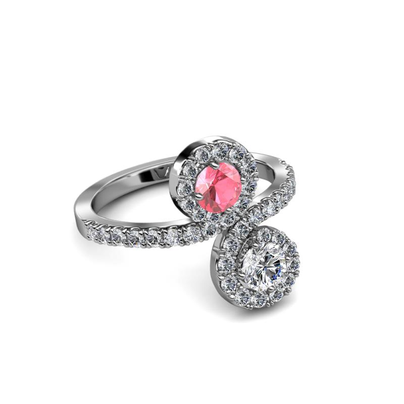 A divine symbol of togetherness, where one stone represents love and one friendship while each end of the ring swirls around the marvelous combination of Diamond & Pink Tourmaline meeting above and below, rather than in the center.