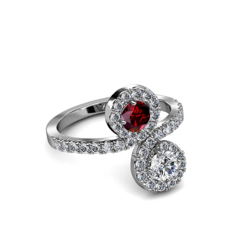 A divine symbol of togetherness, where one stone represents love and one friendship while each end of the ring swirls around the marvelous combination of Diamond & Ruby meeting above and below, rather than in the center.