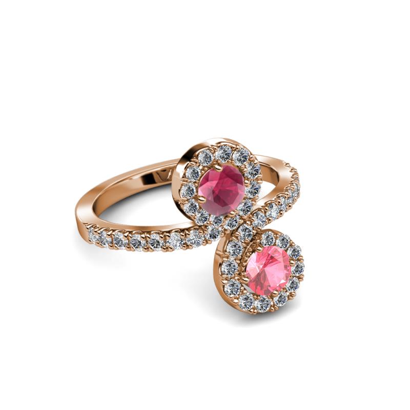 A divine symbol of togetherness, where one stone represents love and one friendship while each end of the ring swirls around the marvelous combination of Pink Tourmaline & Rhodolite Garnet meeting above and below, rather than in the center.