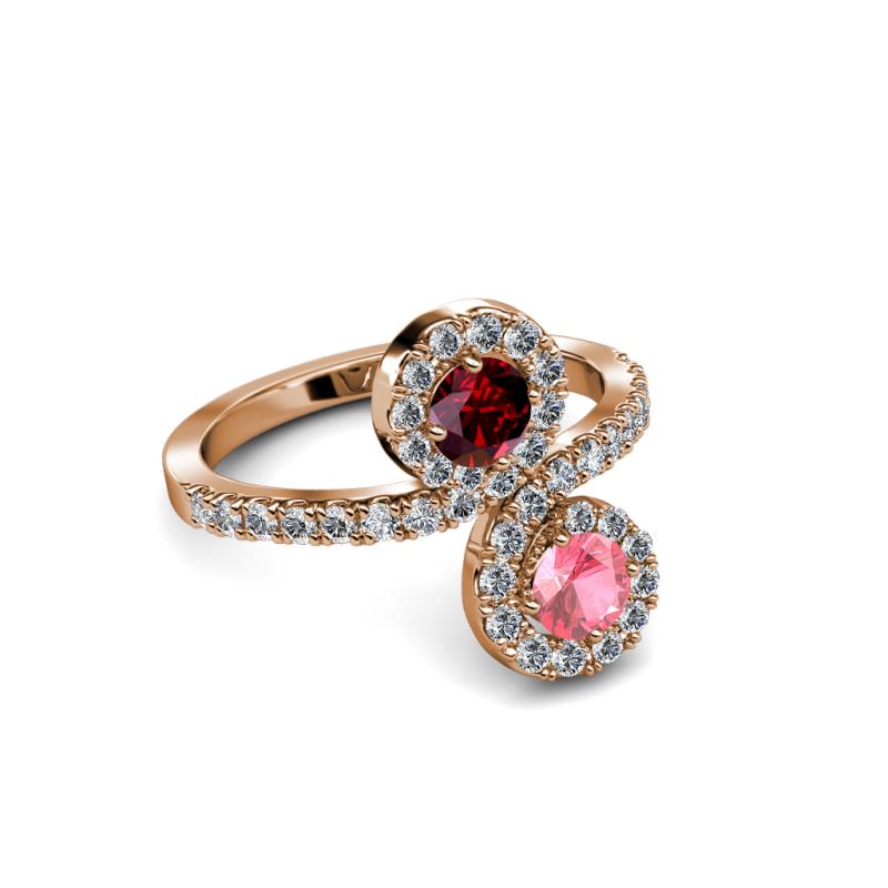 A divine symbol of togetherness, where one stone represents love and one friendship while each end of the ring swirls around the marvelous combination of Pink Tourmaline & Ruby meeting above and below, rather than in the center.