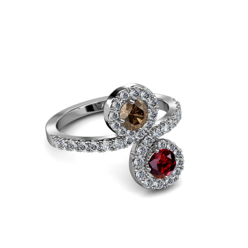A divine symbol of togetherness, where one stone represents love and one friendship while each end of the ring swirls around the marvelous combination of Ruby & Smoky Quartz meeting above and below, rather than in the center.