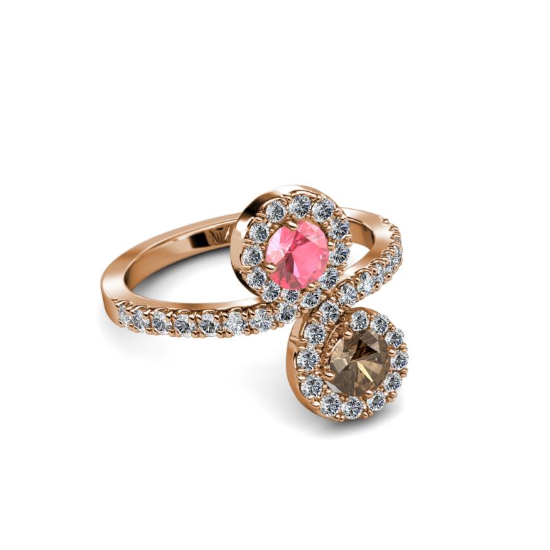 A divine symbol of togetherness, where one stone represents love and one friendship while each end of the ring swirls around the marvelous combination of Smoky Quartz & Pink Tourmaline meeting above and below, rather than in the center.