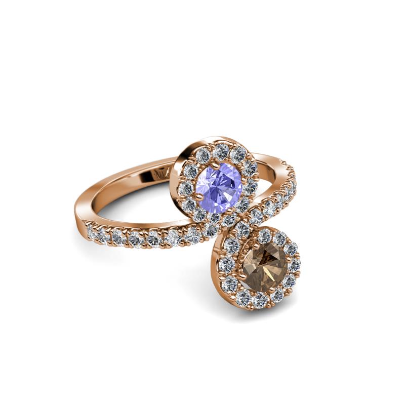 A divine symbol of togetherness, where one stone represents love and one friendship while each end of the ring swirls around the marvelous combination of Smoky Quartz & Tanzanite meeting above and below, rather than in the center.