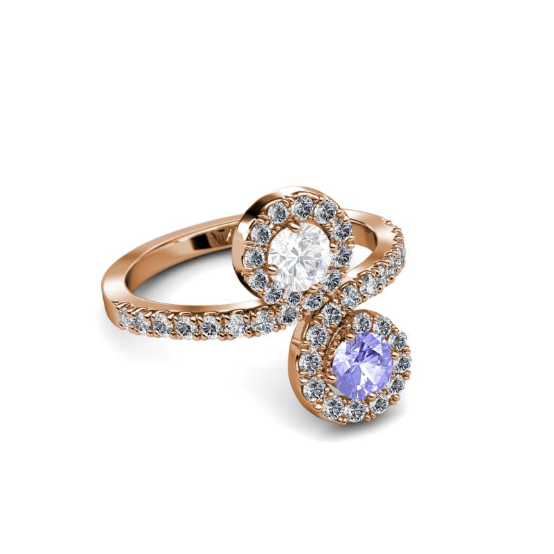 A divine symbol of togetherness, where one stone represents love and one friendship while each end of the ring swirls around the marvelous combination of Tanzanite & White Sapphire meeting above and below, rather than in the center.