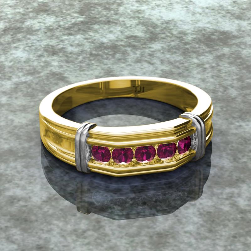 • Channel-set arrangement with 5 Rhodolite Garnet 0.58 ctw/3 mm, offering various framing styles.