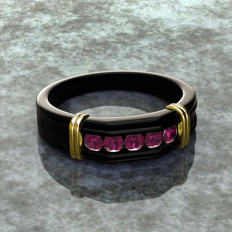 0.58 ctw Round 5 Rhodolite Garnet (3 mm) using Channel setting Men Wedding Band in 14K Black Gold More Details ...