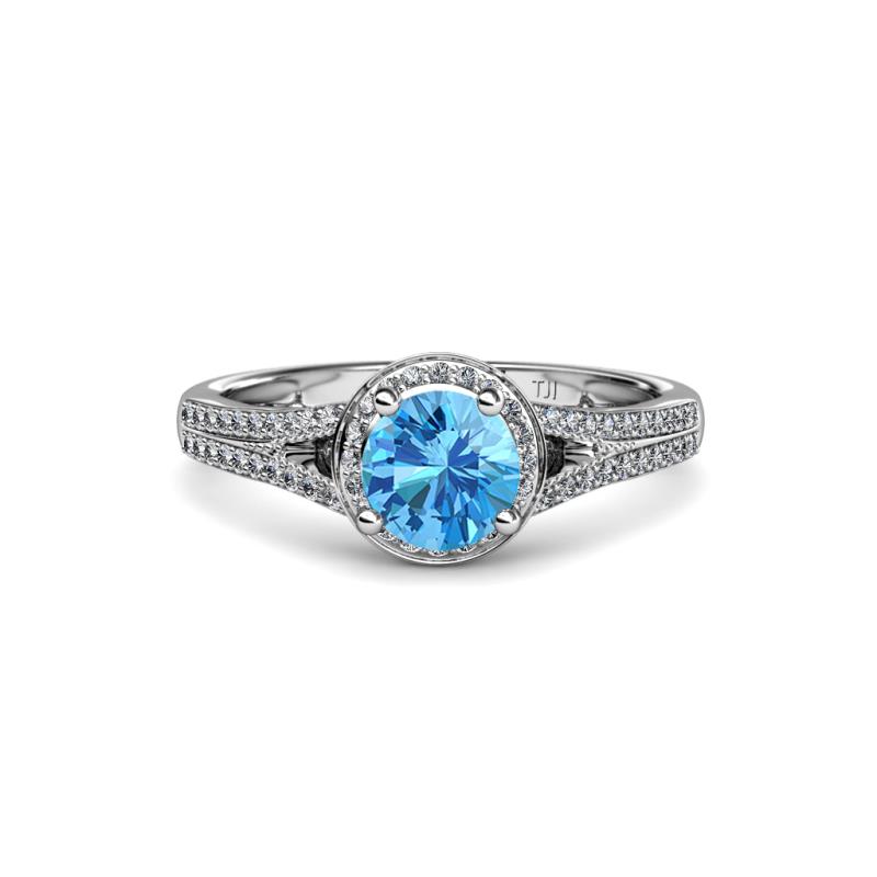 Make a beautiful beginning with this Engagement Ring where Halo of Diamonds hold the Center Blue Topaz while the Ring's shank has Milgrain detailing in the open split continuing with row of Diamonds and side undergallery work with single Bezel set Diamond which alltogether makes it look vintage and royal.