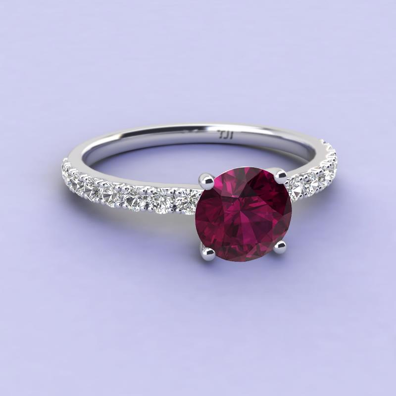 You can never go wrong with the enduring sophistication of a round-shaped stone. This refined Engagement Ring has center Round Rhodolite Garnet, set on a Diamond accented band.