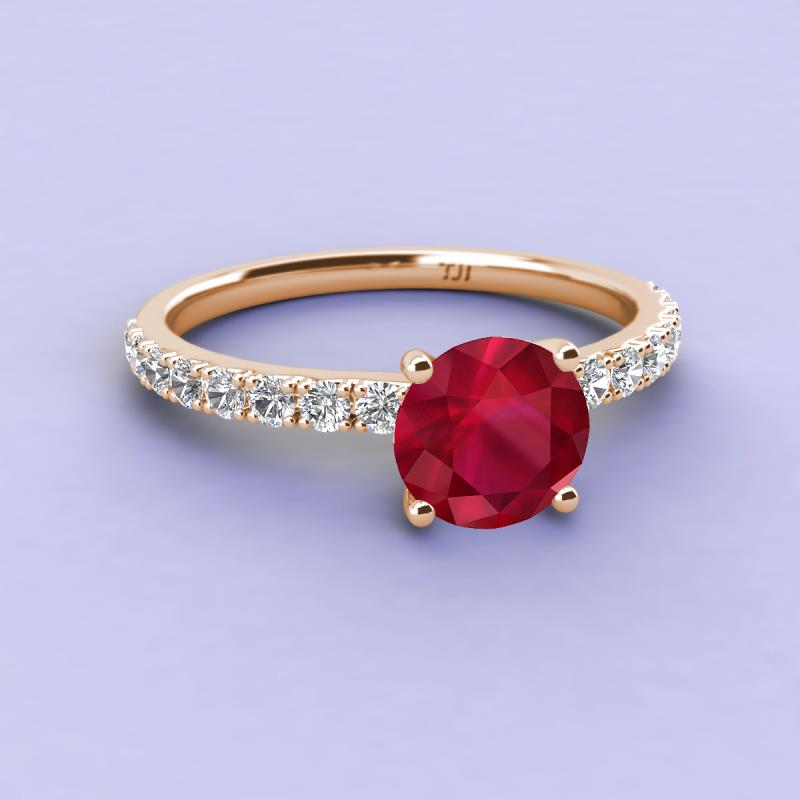 You can never go wrong with the enduring sophistication of a round-shaped stone. This refined Engagement Ring has center Round Ruby, set on a Diamond accented band.