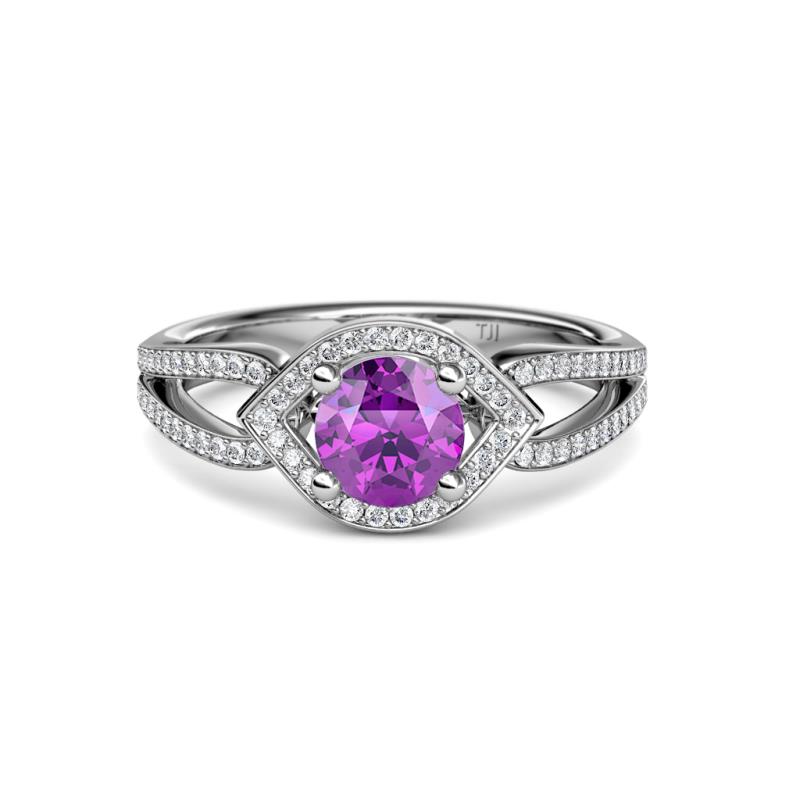 Get one of a kind engagement ring for a proposal to remember, with Center Amethyst embraced by eye shaped halo of Diamonds with single row open split pave shank which makes it a mix of vintage elegance and modern design