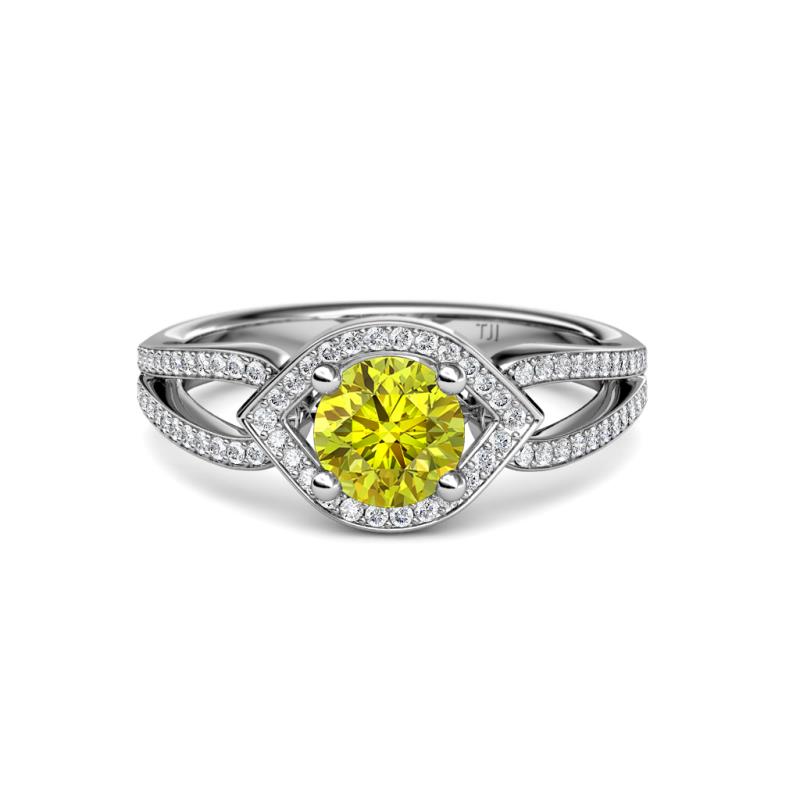 Get one of a kind engagement ring for a proposal to remember, with Center Treated Yellow Diamond embraced by eye shaped halo of Diamonds with single row open split pave shank which makes it a mix of vintage elegance and modern design