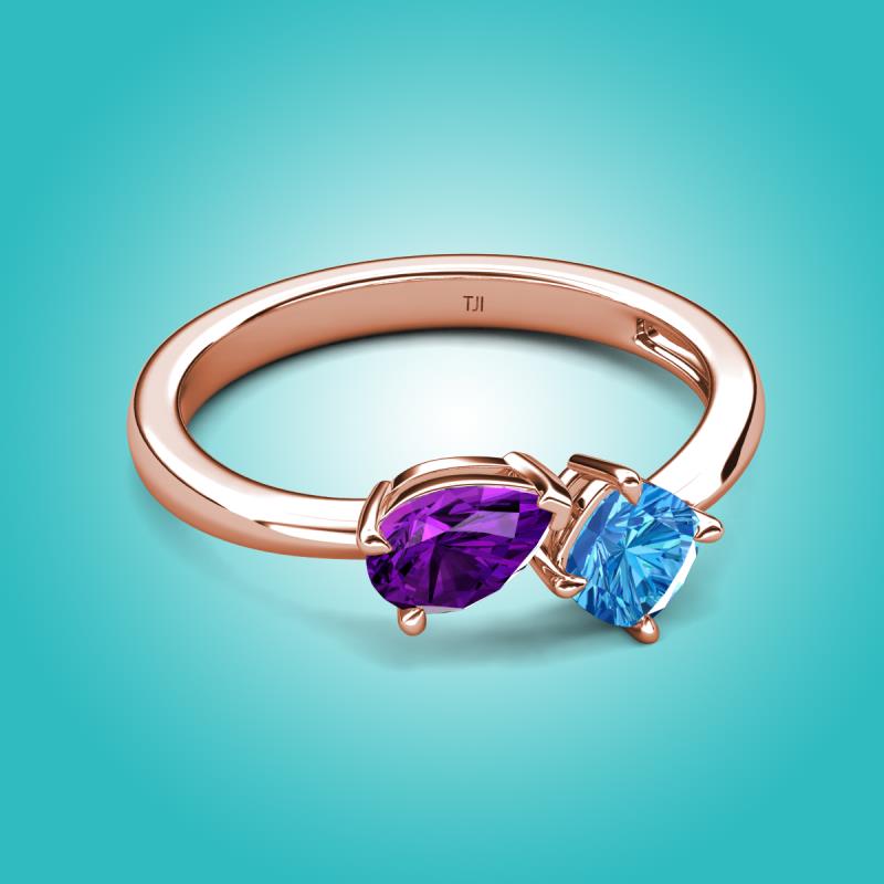 • 1 Amethyst Pear Shape 0.65 ctw/7x5 mm and 1 Blue Topaz Cushion Shape 0.75 ctw/5.00 mm Two Stone Duo Engagement Ring set in a Prong Setting.