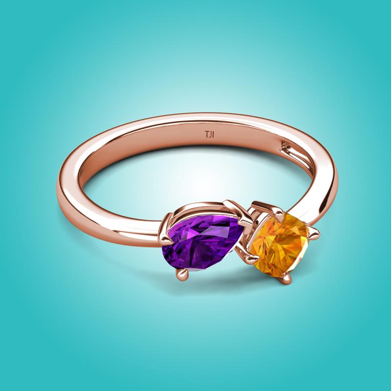 The Amethyst Pear Shape and Citrine Cushion Shape Two Stone Engagement Ring of 1.15 ctw set in a Prong setting, is a stunning piece of jewelry that features a unique Toi et Moi design, which means You and Me in French, symbolizing the union of two souls in love and giving a comfort fit to the wearer.