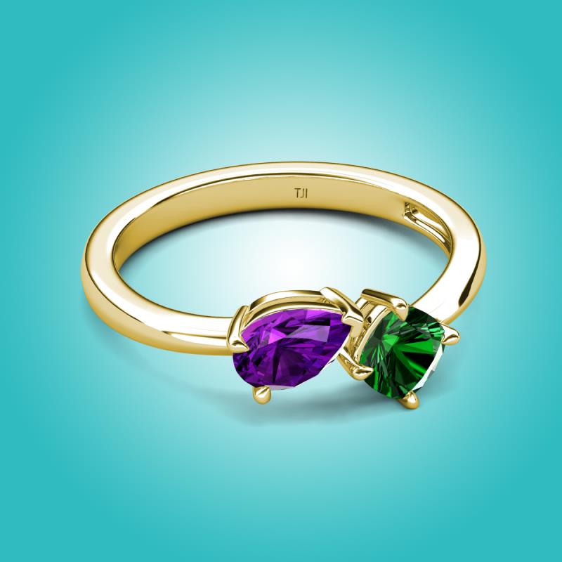 The Amethyst Pear Shape and Lab Created Emerald Cushion Shape Two Stone Engagement Ring of 1.20 ctw set in a Prong setting, is a stunning piece of jewelry that features a unique "Toi et Moi" design, which means "You and Me" in French, symbolizing the union of two souls in love and giving a comfort fit to the wearer.
