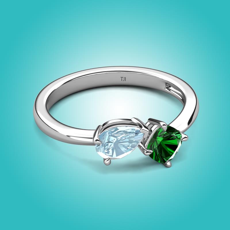 The Aquamarine Pear Shape and Lab Created Emerald Cushion Shape Two Stone Engagement Ring of 1.15 ctw set in a Prong setting, is a stunning piece of jewelry that features a unique "Toi et Moi" design, which means "You and Me" in French, symbolizing the union of two souls in love and giving a comfort fit to the wearer.