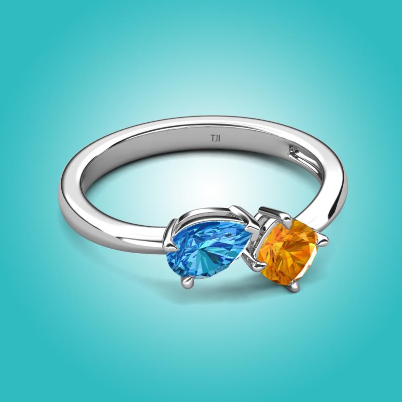 The Blue Topaz Pear Shape and Citrine Cushion Shape Two Stone Engagement Ring of 1.35 ctw set in a Prong setting, is a stunning piece of jewelry that features a unique "Toi et Moi" design, which means "You and Me" in French, symbolizing the union of two souls in love and giving a comfort fit to the wearer.