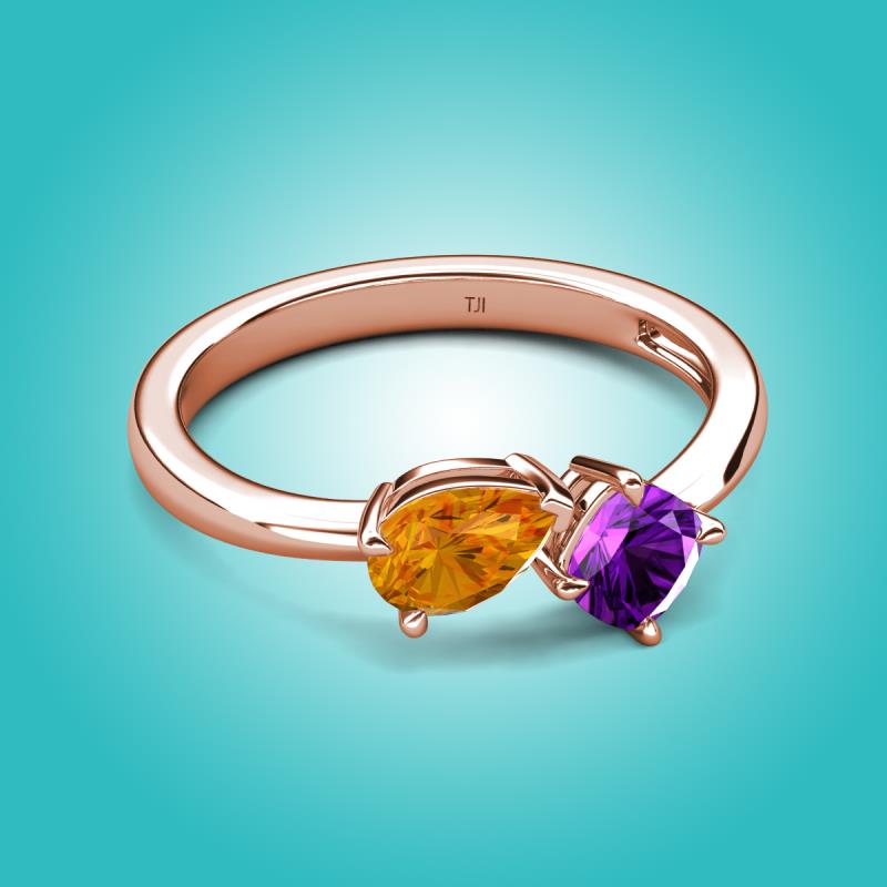 The Citrine Pear Shape and Amethyst Cushion Shape Two Stone Engagement Ring of 1.15 ctw set in a Prong setting, is a stunning piece of jewelry that features a unique Toi et Moi design, which means You and Me in French, symbolizing the union of two souls in love and giving a comfort fit to the wearer.