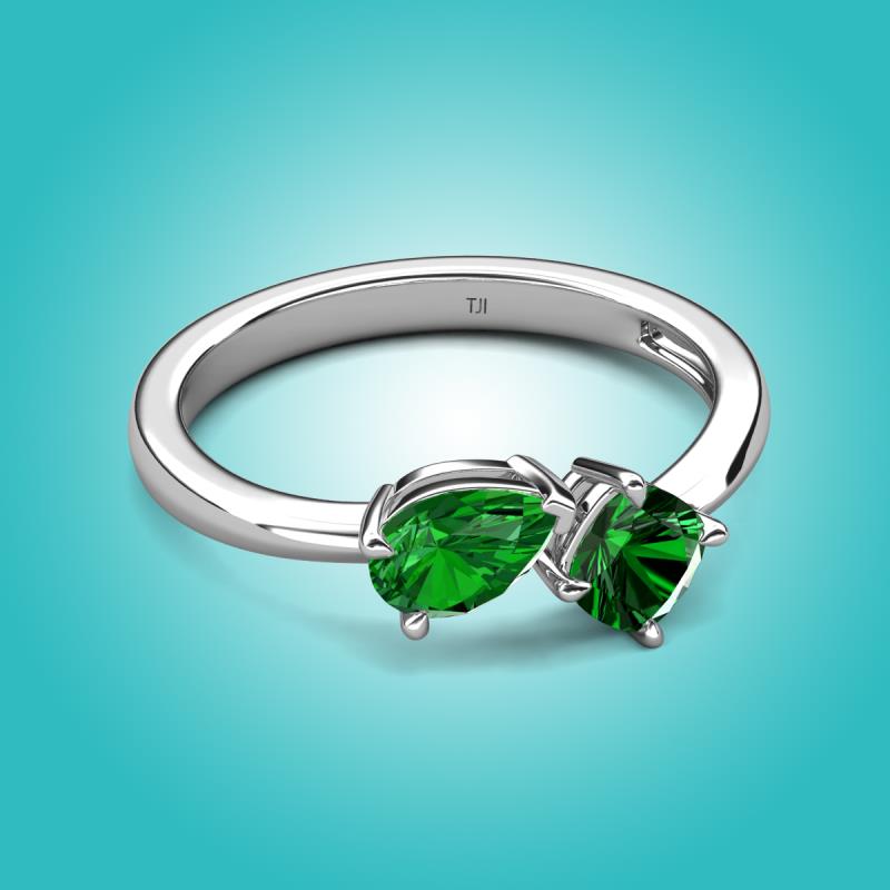 The Green Garnet Pear Shape and Lab Created Emerald Cushion Shape Two Stone Engagement Ring of 1.35 ctw set in a Prong setting, is a stunning piece of jewelry that features a unique "Toi et Moi" design, which means "You and Me" in French, symbolizing the union of two souls in love and giving a comfort fit to the wearer.