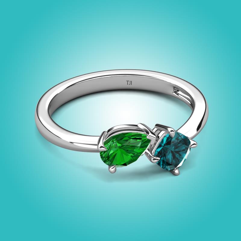 The Green Garnet Pear Shape and London Blue Topaz Cushion Shape Two Stone Engagement Ring of 1.55 ctw set in a Prong setting, is a stunning piece of jewelry that features a unique "Toi et Moi" design, which means "You and Me" in French, symbolizing the union of two souls in love and giving a comfort fit to the wearer.
