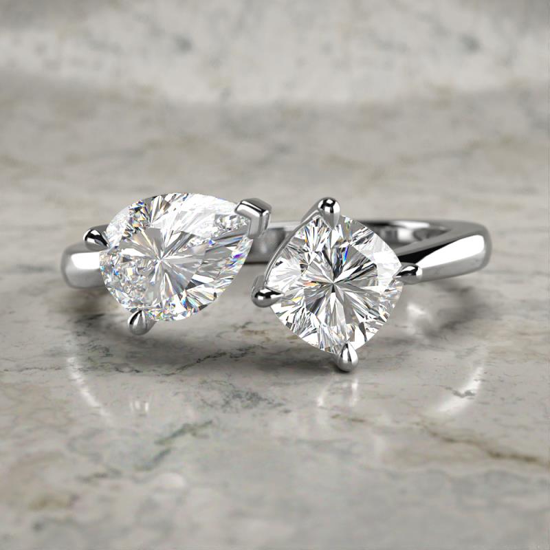 The IGI Certrified Lab Grown Diamond Pear Shape and Lab Grown Diamond Cushion Shape Two Stone Engagement Ring of 1.25 ctw set in a Prong setting, is a stunning piece of jewelry that features a unique Toi et Moi design, which means You and Me in French, symbolizing the union of two souls in love and giving a comfort fit to the wearer.
