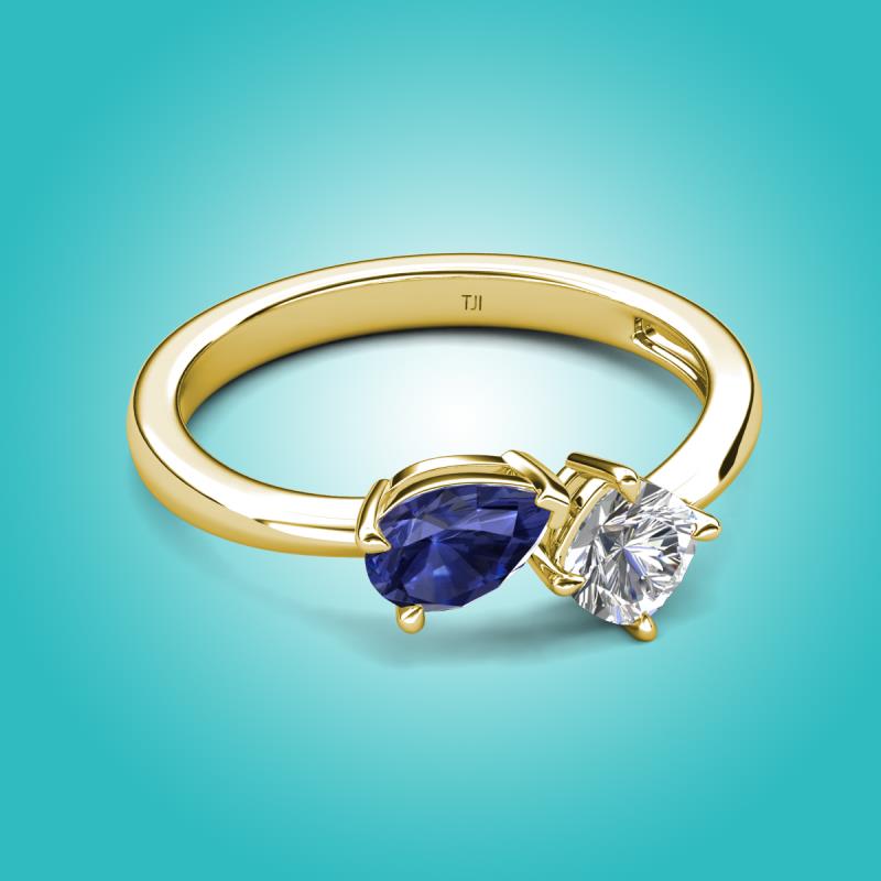 The Iolite Pear Shape and Moissanite Cushion Shape Two Stone Engagement Ring of 1.17 ctw set in a Prong setting, is a stunning piece of jewelry that features a unique "Toi et Moi" design, which means "You and Me" in French, symbolizing the union of two souls in love and giving a comfort fit to the wearer.