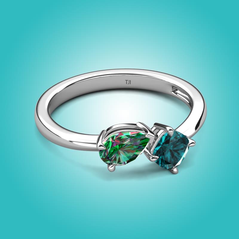 • 1 Lab Created Alexandrite Pear Shape 0.86 ctw/7x5 mm and 1 London Blue Topaz Cushion Shape 0.75 ctw/5.00 mm Two Stone Duo Engagement Ring set in a Prong Setting.