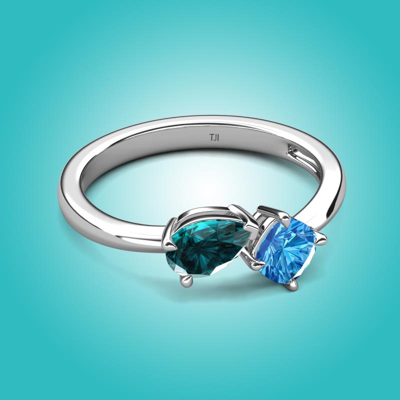 The London Blue Topaz Pear Shape and Blue Topaz Cushion Shape Two Stone Engagement Ring of 1.60 ctw set in a Prong setting, is a stunning piece of jewelry that features a unique "Toi et Moi" design, which means "You and Me" in French, symbolizing the union of two souls in love and giving a comfort fit to the wearer.