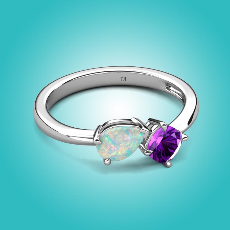 • 1 Opal Pear Shape 0.35 ctw/7x5 mm and 1 Amethyst Cushion Shape 0.50 ctw/5.00 mm Two Stone Duo Engagement Ring set in a Prong Setting.