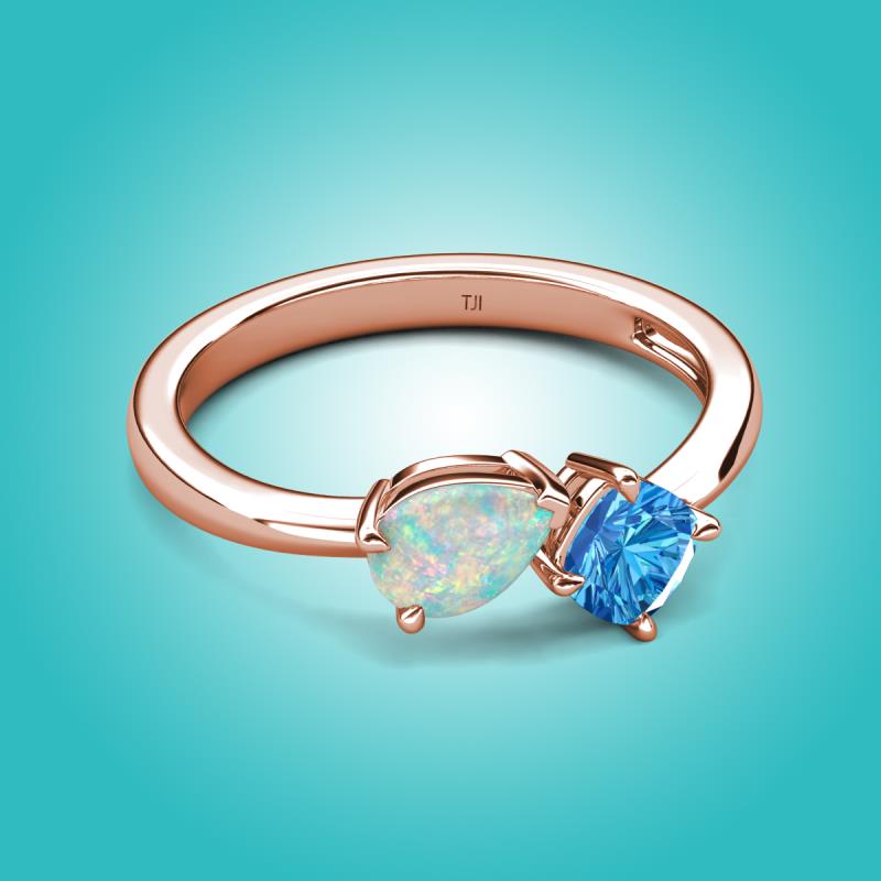 • 1 Opal Pear Shape 0.35 ctw/7x5 mm and 1 Blue Topaz Cushion Shape 0.75 ctw/5.00 mm Two Stone Duo Engagement Ring set in a Prong Setting.