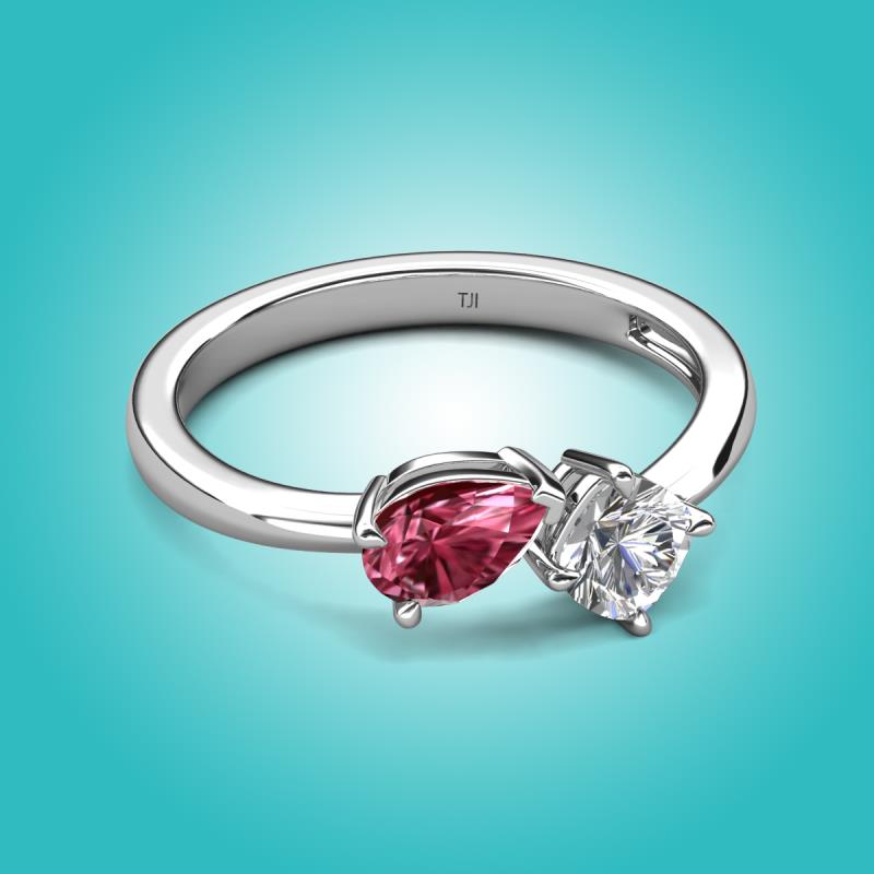 The Pink Tourmaline Pear Shape and Moissanite Cushion Shape Two Stone Engagement Ring of 1.27 ctw set in a Prong setting, is a stunning piece of jewelry that features a unique "Toi et Moi" design, which means "You and Me" in French, symbolizing the union of two souls in love and giving a comfort fit to the wearer.