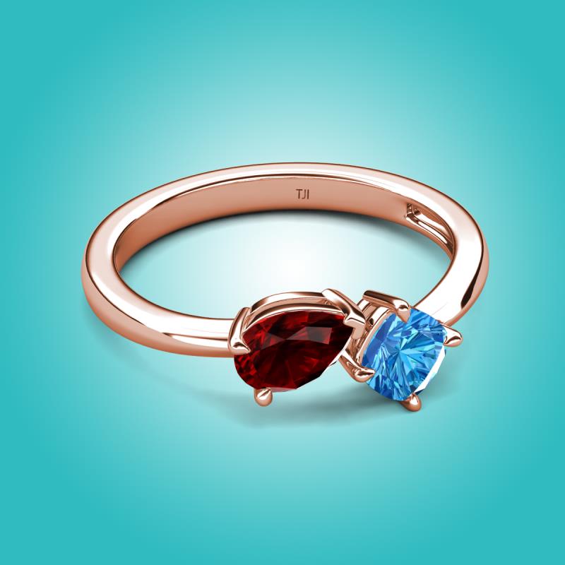 The Red Garnet Pear Shape and Blue Topaz Cushion Shape Two Stone Engagement Ring of 1.65 ctw set in a Prong setting, is a stunning piece of jewelry that features a unique "Toi et Moi" design, which means "You and Me" in French, symbolizing the union of two souls in love and giving a comfort fit to the wearer.