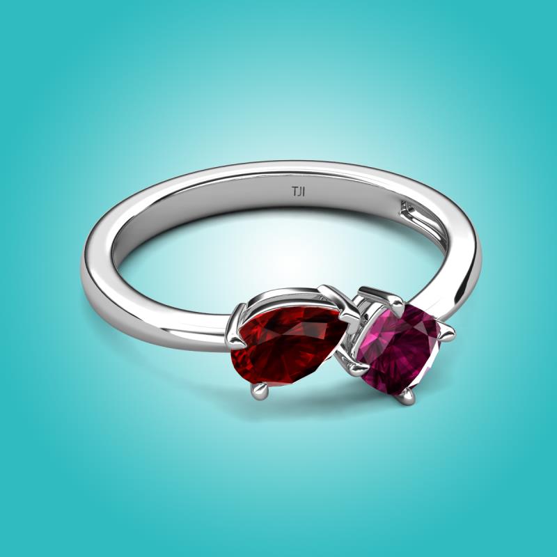 • 1 Red Garnet Pear Shape 0.90 ctw/7x5 mm and 1 Rhodolite Garnet Cushion Shape 0.62 ctw/5.00 mm Two Stone Duo Engagement Ring set in a Prong Setting.