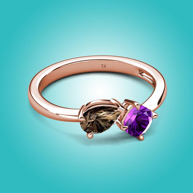 • 1 Smoky Quartz Pear Shape 0.65 ctw/7x5 mm and 1 Amethyst Cushion Shape 0.50 ctw/5.00 mm Two Stone Duo Engagement Ring set in a Prong Setting.