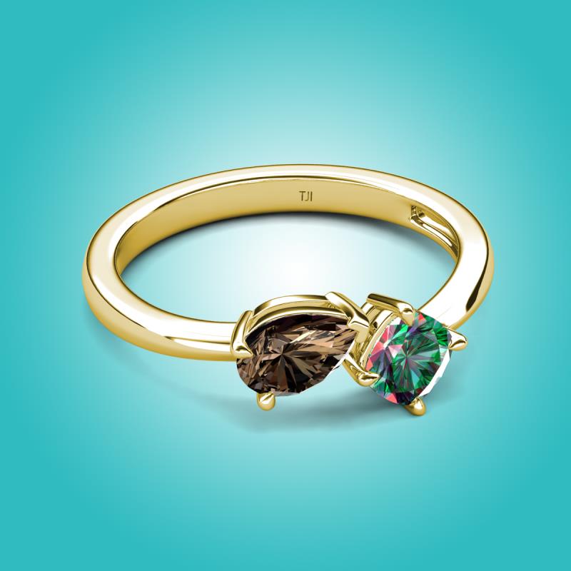 The Smoky Quartz Pear Shape and Lab Created Alexandrite Cushion Shape Two Stone Engagement Ring of 1.46 ctw set in a Prong setting, is a stunning piece of jewelry that features a unique "Toi et Moi" design, which means "You and Me" in French, symbolizing the union of two souls in love and giving a comfort fit to the wearer.