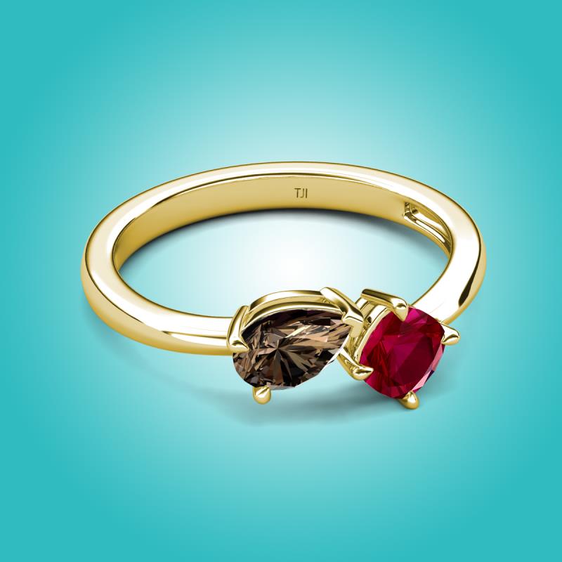 1.46 ctw Smoky Quartz Pear Shape 7x5 mm & Lab Created Ruby Cushion Shape 5.00 mm with Prong setting Two Stone Duo Women Engagement Ring in 18K Yellow Gold More Details ...