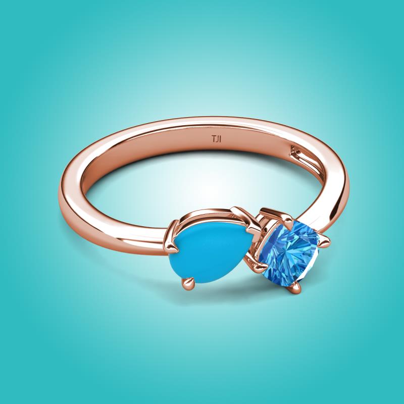 • 1 Turquoise Pear Shape 0.35 ctw/7x5 mm and 1 Blue Topaz Cushion Shape 0.75 ctw/5.00 mm Two Stone Duo Engagement Ring set in a Prong Setting.